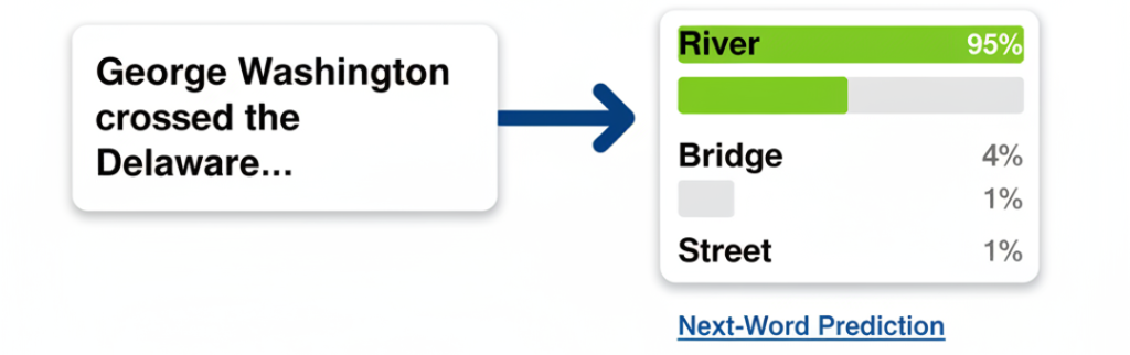Large language models (LLMs) like ChatGPT operate on this same predictive foundation, but instead of forecasting purchases or home values, they predict language—one word at a time. When a model begins a sentence such as “George Washington crossed the Delaware…” it evaluates billions of examples of similar sequences to determine the most likely next word. The model may surface a distribution of plausible options— “river,” “bridge,” “street”—but identifies “river” as the best continuation. This word-by-word forecasting is what makes conversational A.I. feel coherent and intelligent. Ultimately, whether the task is recommending a movie or generating text, A.I. is best understood as a highly sophisticated prediction machine powered by the patterns of the past.