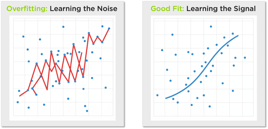 Second is separating real, predictive signal from meaningless noise—also known as regularization. Given enough data, it’s easy for a traditional model to “explain” the past perfectly by latching onto irrelevant quirks, such as the precise stadium attendance when a baseball player happened to hit a 98-mph line drive. That produces a flawless historical fit but a terrible forecast.