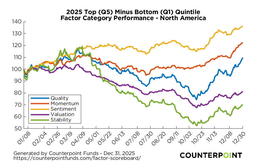 This is an informational resource only. The above factor category returns do not represent returns of holdings of Counterpoint’s Tactical Equity Fund. We compute factor categories by blending returns of individual factors in an equal-weighted manner. Counterpoint uses these individual factors as early-stage inputs to its equity funds’ market-neutral models. These returns are meant to give investors an indication of what is happening to broad factor return categories for various time frames. While these are not returns to Counterpoint’s funds, there may be a correlation between performance on the Factor Scoreboard and the funds’ market-neutral component.