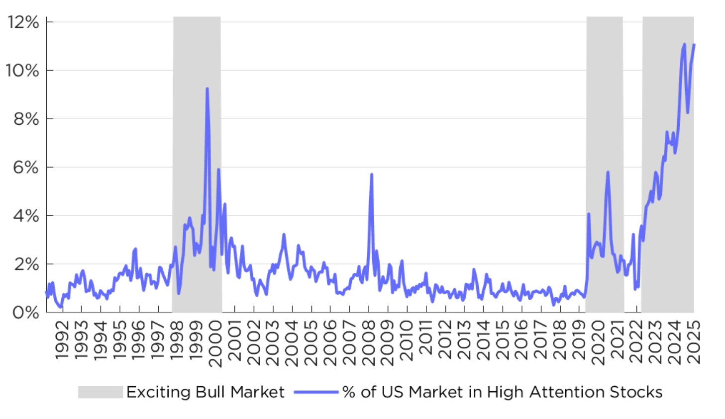 According to our measurements, the number of stocks driven by investor attention, and thus potentially overvalued relative to fundamentals, has been rising sharply for several years, and is currently near all-time highs. This year, stocks with poor factor characteristics (expensive valuations, poor profitability measurements, etc.) have risen far faster than higher quality stocks. This recent chart shows the MS Unprofitable Tech Index outperforming the S&P 500 by almost 25% since April 8th, 2025.