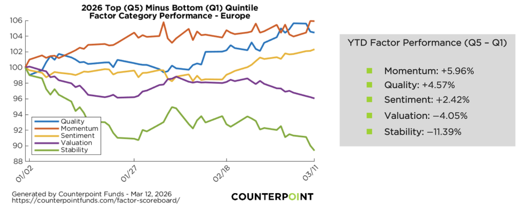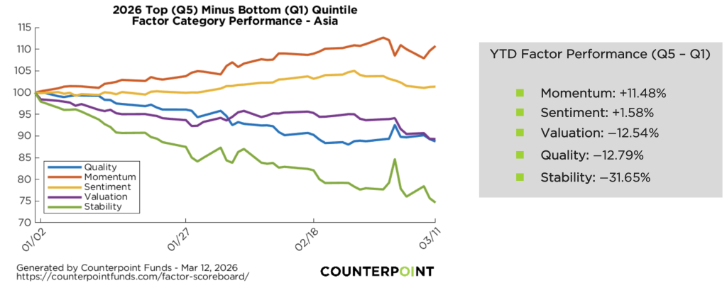 As of March 11, 2026, year-to-date factor performance has been characterized by strong momentum leadership, improving quality exposure in developed markets, and persistent underperformance of defensive and valuation factors, with regional dispersion particularly evident in Asia. The Counterpoint Factor Scoreboard1 factor spread charts (Q5 minus Q1 quintile returns) highlight a market regime where trend persistence and earnings revisions dominate, while low-risk and valuation signals have lagged significantly.