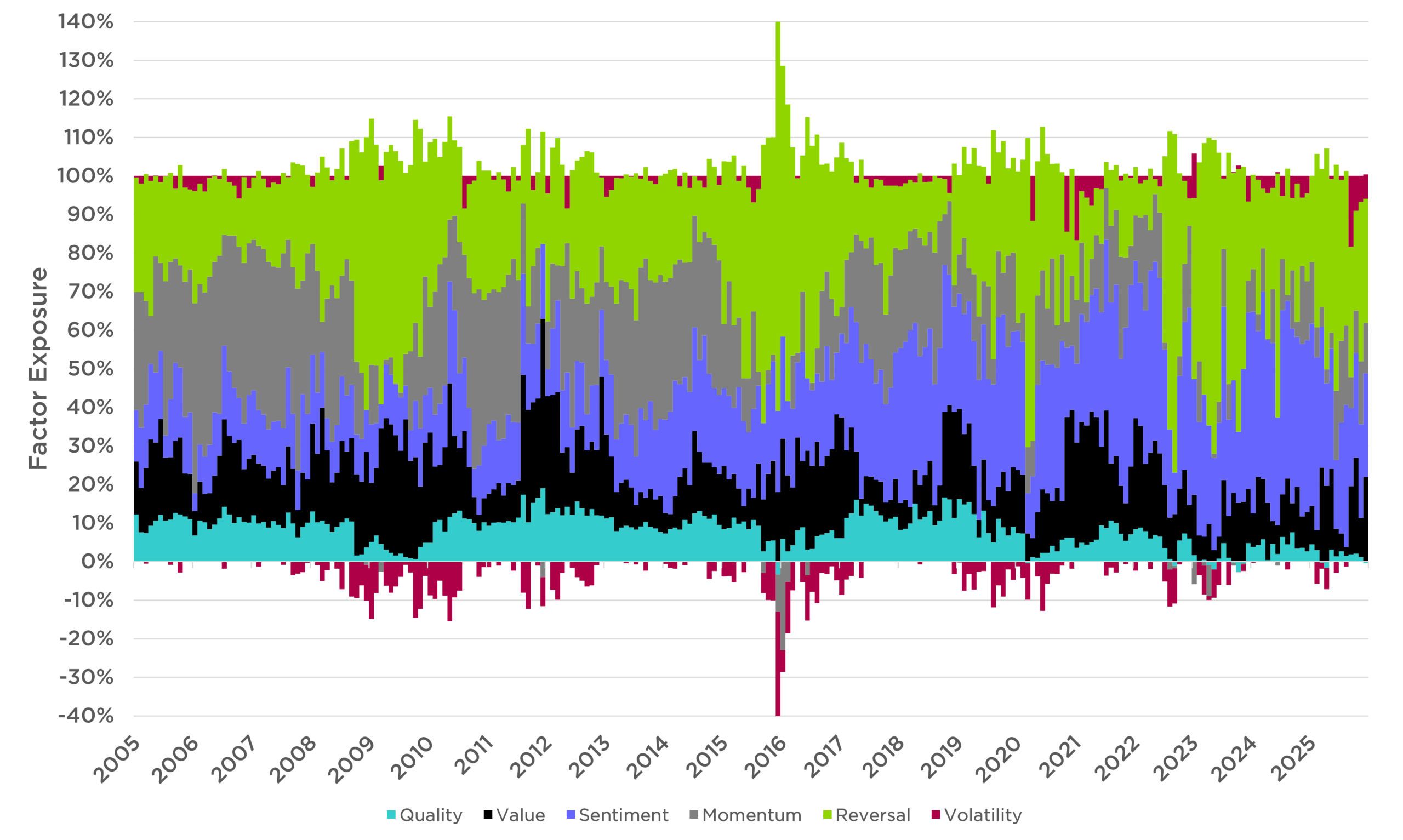 Time Period: January 1, 1998, to January 1, 2026. The chart displays the factor exposure of the top 100 stocks determined by the model and displays shifts in factor style over time. Positive and negative factor weightings must sum to 100%, so where a factor may contribute negatively in a given period, the sum of all positive factor attributions may be greater than 100%. Factor attributions below the 0% axis subtract from total excess return estimate, often indicating the model takes negative exposure to certain factors because some other factor has positive expectations that exceed the negative contribution. i.e., Volatility factor usually includes lower volatility stocks when the attribution is positive, and higher volatility stocks when the attribution is negative. Likewise, it would show High quality when positive, low quality when negative. It does not show actual investment returns or performance of the fund. Future performance is unknown.