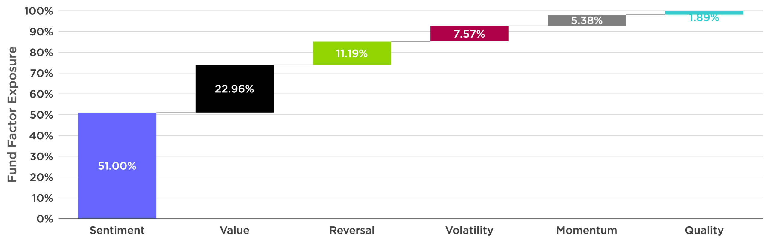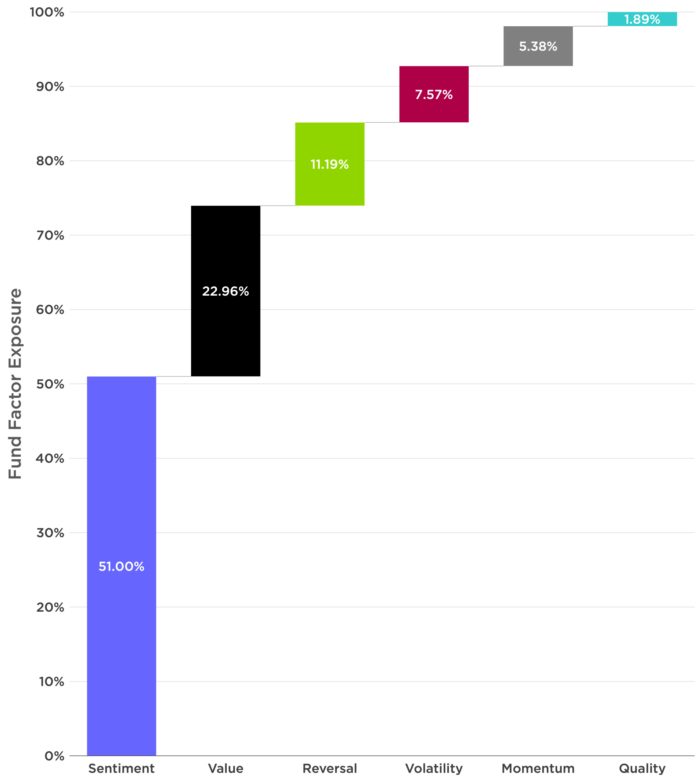 Current factor exposures as of December 31, 2025. The chart displays the factor exposure of the stocks held by the fund as of the last rebalance. Positive and negative factor weightings must sum to 100%, so where a factor may contribute negatively in a given period, the sum of all positive factor attributions may be greater than 100%. Factor attributions below the 0% axis subtract from total excess return estimate, often indicating the model takes negative exposure to certain factors because some other factor has positive expectations that exceed the negative contribution. i.e., Volatility factor usually includes lower volatility stocks when the attribution is positive, and higher volatility stocks when the attribution is negative. Likewise, it would show High quality when positive, low quality when negative. It does not show actual investment returns or performance of the fund. Future performance is unknown.