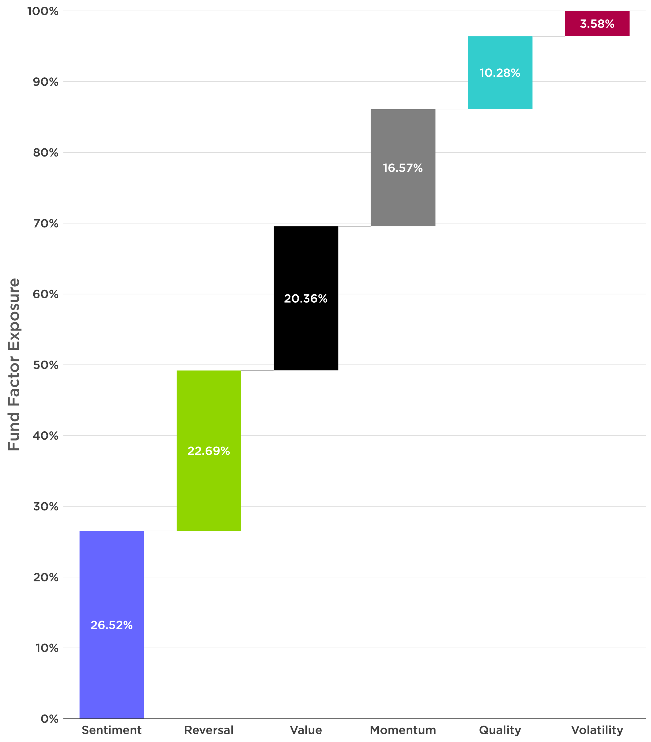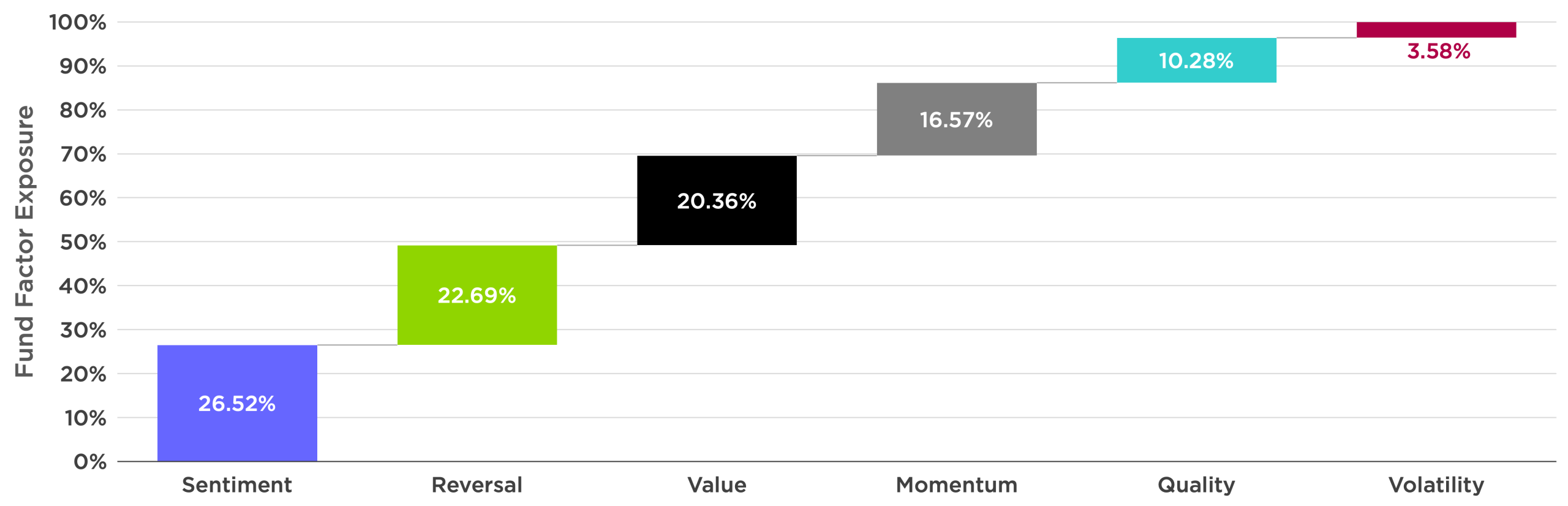 Factor exposures as of September 30, 2025. The chart displays the factor exposure of the stocks invested long and short by the fund as of the last rebalance. Positive factor weightings must sum to 100%. Factor attributions that subtract from total factor exposure estimate, often indicate the model takes negative exposure to certain factors because some other factor has positive expectations that exceed the negative contribution. i.e., Volatility factor usually includes lower volatility stocks when the the attribution is positive, and higher volatility stocks when the attribution is negative. Likewise, it would show High quality when positive, low quality when negative. It does not show actual investment returns or performance of the fund. Future performance is unknown. Additional definitions can be found after disclosures.