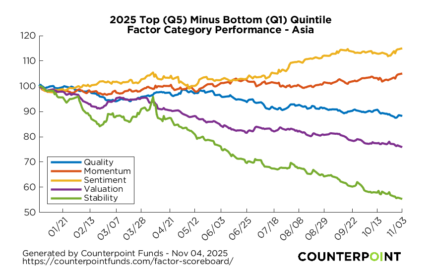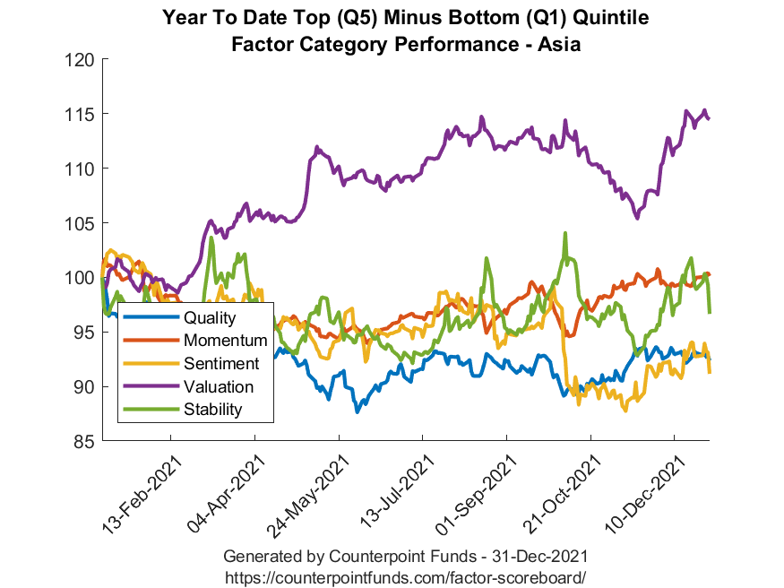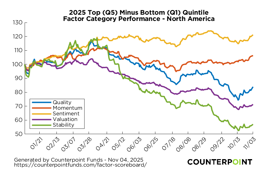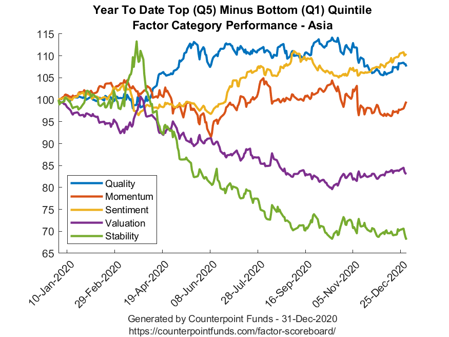 This is an informational resource only. The above factor category returns do not represent returns of holdings of Counterpoint’s Tactical Equity Fund. We compute factor categories by blending returns of individual factors in an equal-weighted manner. Counterpoint uses these individual factors as early-stage inputs to its equity funds’ market-neutral models. These returns are meant to give investors an indication of what is happening to broad factor return categories for various time frames. While these are not returns to Counterpoint’s funds, there may be a correlation between performance on the Factor Scoreboard and the funds’ market-neutral component.