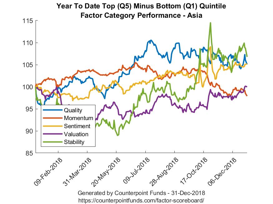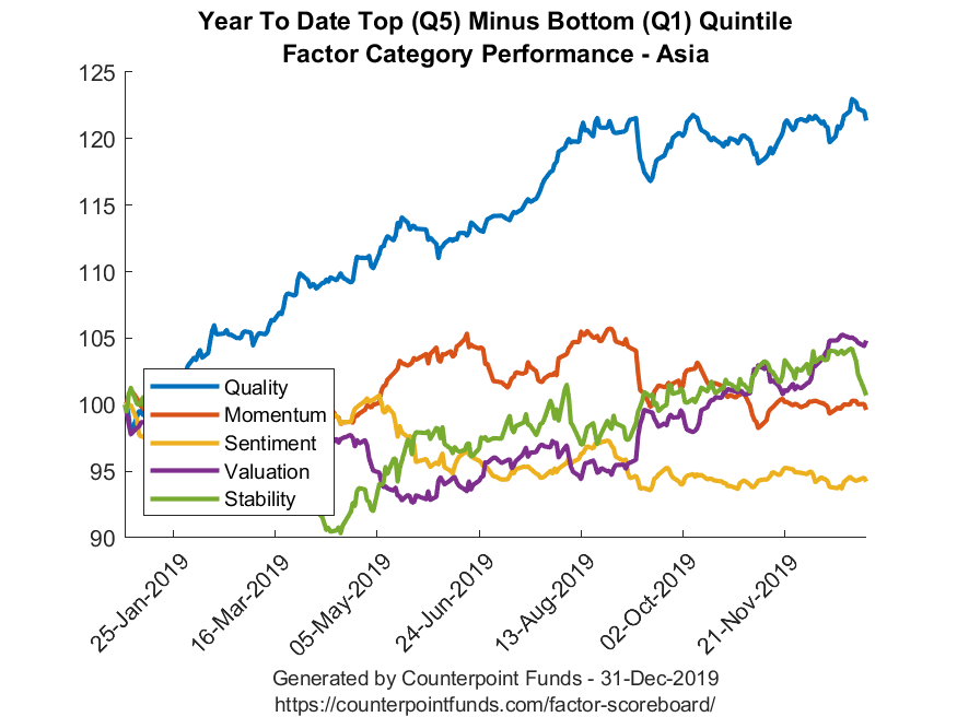 The above factor returns are grouped by quintiles. The 1st quintile (Q1) represents the average daily return of the lowest 20% ranking companies (potential shorts) for the category. The 5th quintile (Q5) represents the average periodic return for the top 20% ranking companies (potential longs) within the same category. Q5-Q1 is the periodic return to a theoretical portfolio that is long all of the top ranked companies and short the lowest ranked companies within the category. This represents an attempt to capture the spread in performance between “good” and “bad” companies. These return calculations assume no transaction costs or market frictions. These returns do not represent the returns of the Funds’ models. They represent raw factor category returns, and are unoptimized long-short returns determined with no consideration of market beta or industry exposure.