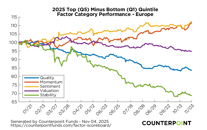 The rankings used to group periodic returns are re-calculated daily based on live market and financial data, and factor category returns are based on live changes in ranking. Year-to-date factor returns are formulated using compounded daily factor returns given daily changing rankings within the period, while trailing 5-day and month-to-date factor returns are formulated using only the latest day’s ranking. This will explain differences between month-to-date and year-to-date returns when date periods overlap.